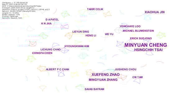 Lack of collaboration is a symptom of lower research productivity [] and strong collaborative relationships should be fostered to make better research progress []. According to the co-authorship analysis (Figure 2) and the collaboration network of countries/regions (Figure 3), although more and more researches have been conducted on ANN in CM in the past 20 years, as a new technology in the digital transformation of the construction industry, collaboration is still in its infancy. Except for a few scholars such as Minyuan Cheng, Hsingchih Tsai, Xuefeng Zhao and Mingyuan Zhang shown in Figure 2 and countries/regions such as the People’s Republic of China and USA, which are active in this field and have moderate cooperation, the research in this field needs extensive attention, promotion and cooperation from more scholars from all over the world and different domains such as mathematics and computing as well as CM. Cooperation among them should be strengthened to enable progress in this cross-disciplinary area.