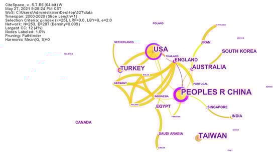 Citation bursts reflect the dynamics and evolution of the field by citing articles with a sharp increase in citations []. The higher the suddenness of a keyword, the more attention is paid to it in the time interval considered, and to some extent, it represents the research frontier and hotspot in the subject area []. Figure 6 shows the top 25 keywords with strongest citations bursts from 2000 to 2020. The light green line indicates the range of literature years reviewed, while the orange line indicates the duration of a citation burst event.