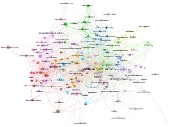 From Table 2, it is revealed that ANN was the keyword with the highest frequency, and was used as the keyword in 75 of 112 articles, which further verifies the rationale of the literature selection. Besides ANN, prediction is the most frequent keyword and the total link strength is 113. Prediction is in the highest level of the keywords indicating the strong inter-relatedness between ANN and prediction. The analysis result that prediction has received considerable attention could be interpreted by the fact that as a powerful algorithm for AI, ANN is an effective tool for prediction []. ANN is typically applied in prediction models for knowledge discovery from a large quantity of information and documents which are generated in the process of construction management, and the result can provide reliable assistance for decision-making [] and optimization []. In addition, ANN can also be used for recognition and classification, such as defect classification [] and construction activity recognition []. Compared with prediction, research on recognition and classification attracts relatively insufficient attention and deserves further exploration in the future.