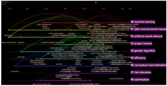 The second largest cluster (#1), ‘labor and personnel issues’, mainly includes research on management, behavior, safety climate, worker, health, etc. The clustering results show that worker safety is another important topic. Especially since 2015, there has been a node explosion in Figure 5 (#1). This result shows that CM has paid great attention to safety and ANN has been widely used in the safety field in recent years. Emerging technologies such as laser scanning and smart sensors have made massive data acquisition a reality, which has provided tremendous support for this development []. Yi, Chan, Wang and Wang [] proposed a system which could be automated by integrating smart sensor technology, location tracking technology and ANN to protect the wellbeing of those who have to work in hot and humid conditions.