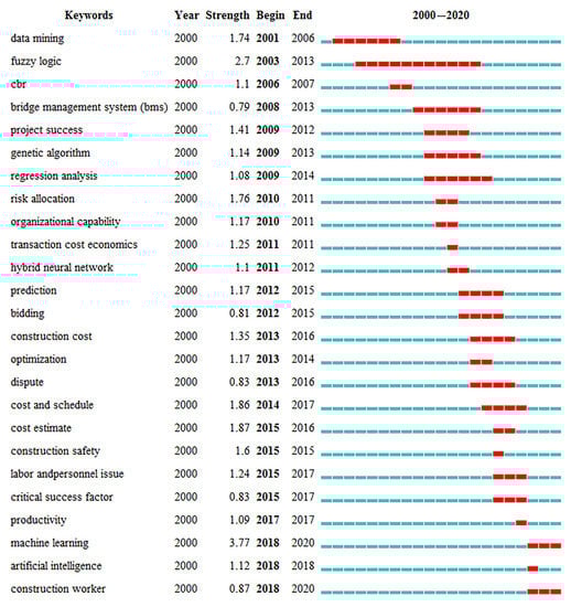 As to the issues, ANN has been applied to bridge management, project success, risk allocation, organizational capability, transaction and construction cost, bidding, dispute, safety, workers and productivity, etc., which have been hot research topics in the past 20 years. Before 2010, risk allocation had strong citation bursts due to the continuous development of the PPP model []. After 2010, Figure 6 shows that cost estimate (burst strength, 1.87), cost and schedule (1.86), had strong citation bursts in the literature. This implies that these were hot topics in the respective years.
