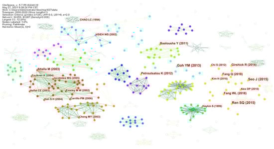 Cluster analysis is used to identify the semantic themes hidden in the textual data. Figure 5 shows a timeline visualization of cluster analysis of keywords which was created by Citespace 5.7.R1. There are three text mining algorithms that can be used to label clusters in CiteSpace. Log-Likelihood ratio (LLR) clustering technique was implemented in this study because of its good clustering results []. The network is divided into 9 major co-citation clusters (with cluster IDs #0, #1, etc.). CiteSpace automatically selects a label for each cluster based on titles, keywords, and abstracts of the articles in each cluster. Usually, the Modularity (Q value) and Mean Silhouette (MS) value are used to evaluate the clustering effect. Generally speaking, Q value is within the interval of [0,1). Q > 0.3 means that the community structure is significantly divided. A cluster’s silhouette value ranges from −1 to 1 and assesses the uncertainty involved in defining the cluster’s nature. A value of 1 signifies that the cluster is perfectly isolated []. As shown in Figure 5, the network has high modularity (Q = 0.581 > 0.3), which shows that the network is divided into clusters with dense links amid nodes within clusters. The MS value is 0.363, indicating that the homogeneity of the clusters is not high. This MS value shows that although the studies in the network in each cluster may be consistent in exploring somewhat similar issues, they address different issues in fact [].