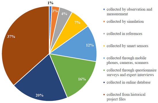 Current research has focused on the development and application of ANN models but ignored the input data preparation. According to Bilal et al. [], the whole data mining work usually takes about 80% of the time to prepare the data. There are many data sources for ANN application in CM, and Figure 8 shows six types of data sources and frequency distribution of all articles. The most two extensive data sources are historical project files and online databases, both of which are important in mining historical engineering data and have the disadvantages of one-time data collection. Only a few scholars realize the importance of establishing a database that can be dynamically updated in real time for a long time, such as Baalousha and Celik [] who created a data warehouse so as to integrate all kinds of cost related information for cost estimation. Meanwhile, because of the complexity of CM, errors in data collection, processing and application are inevitable in most cases. High quality data is the prerequisite for the success of big data projects. Problems such as null value, misleading value, outlier value and non-standard value make the application of ANN extremely challenging. Although previous scholars did consider this problem and have completed data standardization [], they did not conduct comprehensive integration and structured data quality analysis. Future research could focus on efficient and standardized data collection from massive historical engineering files through information technology, and strengthen the development and application of databases to realize sustainable data updating and data mining utilization.