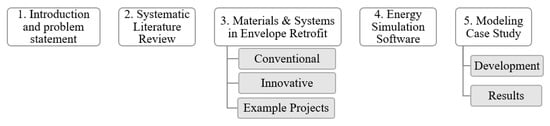 A snapshot overview of this article is shown in Figure 4, which shows the main content, and is comprised of the following sections: (1) the introduction and problem statement; (2) a comprehensive literature review; (3) a review of materials and systems that can be used in a building energy retrofit, and example projects to quantify the impact of different ECMs individually or as a bundle in buildings with different attributes in different climate zones; (4) a review of building energy simulation tools to show example applications and their typical use; and (5) a residential building energy model case study to help stakeholders determine the sensitivity of a residential building against different building envelope ECMs in different climate zones. The result of this study is expected to help overcome the challenges and obstacles that slow the implementation of energy-saving projects, such as information and technical issues identified by researchers [7].