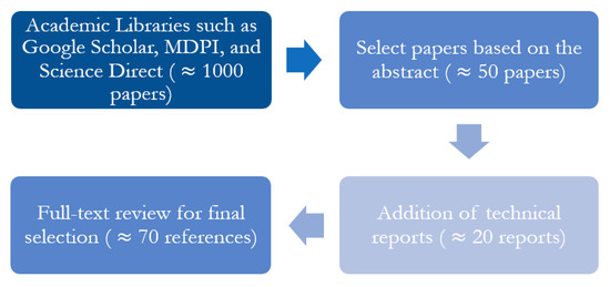 A systematic literature review was performed as a preliminary analysis to select the final articles for more in-depth analysis for case studies. The steps in this literature review includes: (1) mass review of articles’ abstracts based on relevant keywords; (2) identifying papers using more specific keywords and narrowing them down based on their abstract; (3) adding additional references not necessarily listed in archived publications, e.g., “unpublished” technical reports; and (4) examining the full texts for the final selection. This process is summarized in the flow diagram depicted in Figure 5.