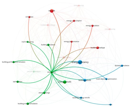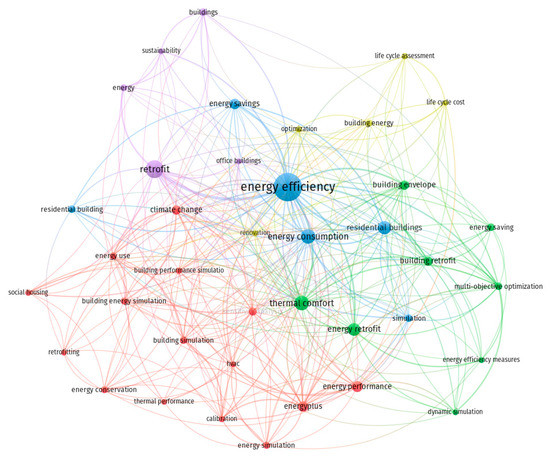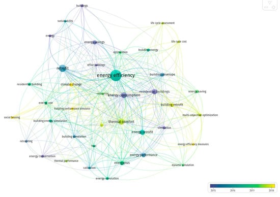 A comprehensive literature review was performed on 1000 articles’ abstracts to collect and study the most used keywords in papers related to “building envelope energy retrofit”. Figure 6 shows the top 39 keywords in the abstracts of these articles associated with building energy retrofit with a repetition higher than 15 times. It can be observed that the top keywords and areas in such articles include (1) energy efficiency, (2) energy retrofit, (3) thermal comfort, (4) energy consumption, (5) residential buildings, and (6) energy performance, indicating the most studied topics. Isolating the papers published after 2018 (Figure 7) shows that some of the most studied keywords shift to newer topics such as (1) climate change, (2) building performance simulation, (3) social housing, (4) energy efficiency measures, and (5) multi-objective optimization.