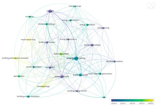 An additional contribution and area of focus in this paper is a sensitivity analysis based on computer simulation, as discussed in Section 5. Therefore, the comprehensive literature review was modified to select simulation-based research studies. Over 1000 papers were reviewed to isolate 25 keywords with at least 25 occurrences, shown in Figure 8. It can be observed that keywords such as EnergyPlus, sensitivity analysis, machine learning, optimization, and dynamic simulation are among the topics with the most interest. In this study, we used an EnergyPlus-based tool (i.e., Beopt) to perform the computer simulations discussed in more detail in Section 5. As depicted in Figure 8, EnergyPlus is one of the most used tools for energy simulation in building energy retrofit studies. The publication dates for these papers are mostly after 2018, and topics such as machine learning are used in more recent publications (Figure 9). As the research interests show diverse simulation tools and methods, a more comprehensive study is needed to review and compare different modeling techniques (e.g., physics-based models vs. data-driven strategies) in building envelope energy retrofits.