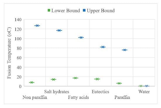 As shown in Table 1, PCMs are materials with high thermal inertia and are activated when the temperature reaches a certain level, typically between 23 and 26 °C, whereby the PCM undergoes a phase transition by absorbing heat. Phase transition could be solid to solid, liquid, or gas, or liquid to gas. The opposite phase transition, i.e., the release of heat by the PCM, occurs when the ambient temperature reaches the set point at night. These materials can be used in walls, floors, and ceilings with an operating temperature range of 20 to 35 °C [30]. Commonly used PCMs with different latent heat and fusion points include paraffin, non-paraffin, fatty acid, salt hydrates, and eutectics, as presented in Figure 11 and Figure 12 (reproduced from [30]). There are lower and upper bounds for these materials’ latent heat and fusion point. Figure 11 compares these materials with water, and it can be seen that the lower and upper bounds of fusion temperature range between 6–17 °C and 75–127 °C, respectively. The same comparison is shown in Figure 12 for latent heat, and the lower and upper bounds are between 70–170 kJ/kg and 220–300 kJ/kg, respectively, compared to water, which has 333 kJ/kg of latent heat.
