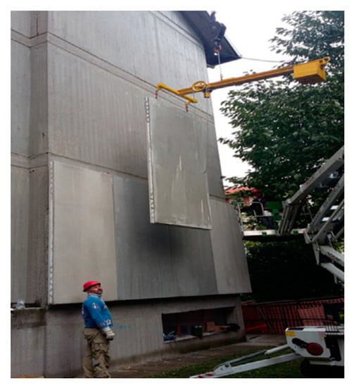 Installation of a prefabricated insulated element (i.e., EPS sandwiched between two layers of TRM) in a retrofit project in Italy (adopted from [43]).