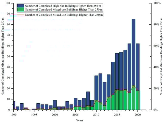 Over the past two decades, there has been unprecedented growth of high-rise buildings worldwide. By the end of 2020, the total number of high-rise buildings in the world, of higher than 250 m in height, reached 510, representing an increase of 192% compared with the 23 high-rise buildings reported in 2010. In particular, the proportion of MUHR buildings has seen a steady increase, as shown in Figure 1. In fact, the Chinese government issued several notices regarding the height of newly constructed buildings in second- and third-tier cities. However, as one of the highly intensive organizational forms of urban cities, the mixed-use development model in China’s first-tier cities not only promotes the rational use of urban land, but also provides a more convenient and richer work and life experience for the high-density population. MUHR buildings have become an important carrier of urban life due to the aggregation of different businesses in a vertical space [,,].