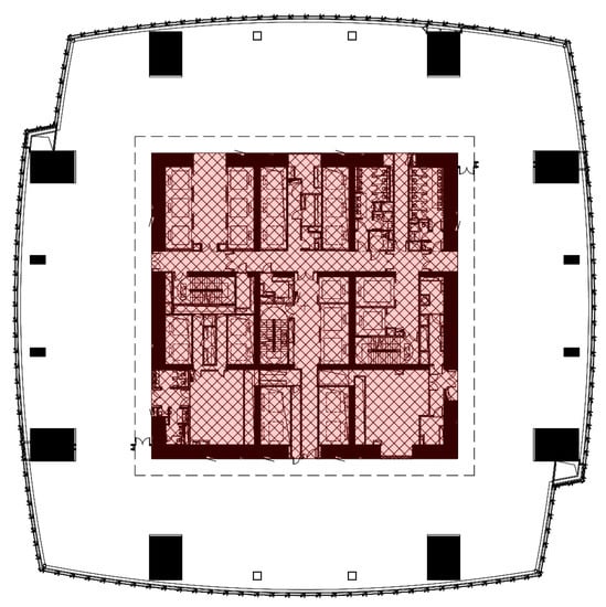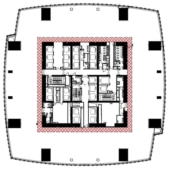 - The core area of the typical floors refers to the area enclosed by the outer boundary of the core structure, as shown in Figure 5. The core refers to the central part of a building, which consists of elevator shafts, stairs, ventilation shafts, cable shafts, public restrooms, and some equipment rooms. It forms a frame-tube structure with peripheral frames and is made of reinforced concrete. In all the studied buildings, the central tube design was adopted.