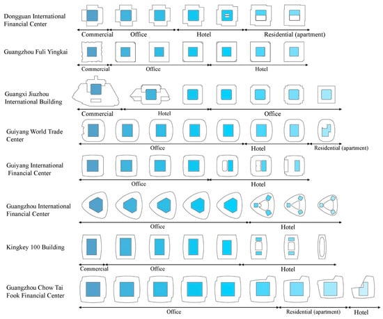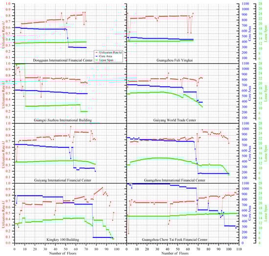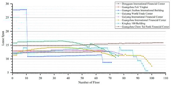 As shown in Figure 9 and Figure 10, the eight buildings mainly showed three trends/categories. The first category is seen in the Guangzhou Chow Tai Fook Financial Center and the Guangxi Jiuzhou International Building. In order to adapt to the lease span requirements of different business types, the typical floor area is continuously reduced with the narrowing of the building shape. The second category is seen in the Guiyang World Trade Center, the Guangzhou International Finance Center, and the Kingkey 100 Building. This category shows a curved variation of the typical floor area from the ground floor to the top floor. The typical floor area gradually decreases as the building shape changes, in order to adapt to the changes in the lease span and core structure. The third category has a constant typical floor area, such as the Dongguan International Financial Center, the Guangzhou Fuli Yingkai, and the Guiyang International Financial Center. In these buildings, functional transformation was realized through the core design, which is common in high-rise buildings below 300 m. The variation of the typical floor area and the building shape are closely related to the lease span demand of each business type and the vertical distribution of the business types. Statistically speaking, the lease span of the typical floor of office spaces is in the range of 12–16 m. Except for the traffic space around the core, the lease span of the office space is generally 10–14 m. Considering the requirements for sunlight in the residential and hotel spaces, most rooms have a lease span of 9 m. The commercial space of the Guangxi Jiuzhou International Building had a lease span of about 25 m, which is less than that of the commercial complex buildings, as shown in Figure 11. Therefore, the vertical distribution of different business types and the demand for the lease span of each business type will lead to adjustments to the shape of MUHR buildings.