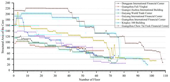 In order to study the structural area of MUHR buildings, the structural area was divided into the peripheral column area and the core area, which facilitated the calculation of the ratio of different structural designs to the building area. The structural area of each typical floor of MUHR buildings is quite different. The structural area of the peripheral column and that of the core show the same trend, which is as follows: the higher the building, the larger the structural area. In the eight high-rise buildings, the structural area decreased with the number of floors, as shown in Figure 17 and Figure 18.