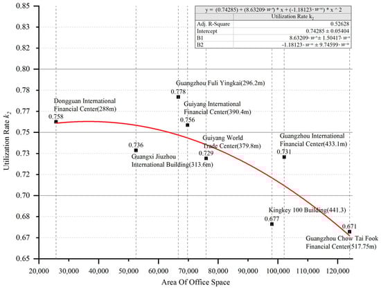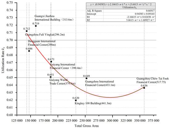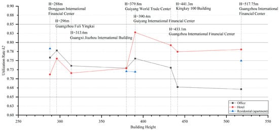 - The business utilization rate k2 and tower utilization rate k3 were calculated from the basic data of the typical floor utilization rate k1 study. Firstly, as mentioned above, the statistics of different cases, business types, tower utilization rates, and related data indicators can provide a high-value reference basis for designers who first encounter mixed-use super tall buildings. Secondly, after the k2 calculation and data analysis of the utilization rate of office business, it was found that there is an obvious negative correlation between the utilization rate of a business and the floor area of a business. The larger the total area of the office business, the higher the demand for the vertical transportation system, structural system, pipe well, supporting service space, and so on. Under the demand of a high-quality space depth of office business, the utilization rate of the office business will always decrease. Using the tower utilization rate k3, it was found that the number of equipment rooms and refuge floors in higher-tiered projects is higher, and the usable area of the business space is constantly compressed. The balance between these supporting areas is the complexity of mixed-use super high-rise buildings, which is also a difficult design point. How to improve the utilization rate through good coordination in terms of building and structure, equipment, and the reasonable arrangement of vertical traffic is an urgent issue to be solved in future research. In addition, the lowest point value appears in Figure 29. Does it mean that there exists a minimum value of floor area and utilization rate k3? This is a very valuable study. However, at present, due to the limited research sample, it is not possible to fully present this conclusion, and follow-up studies are required to confirm this conclusion.