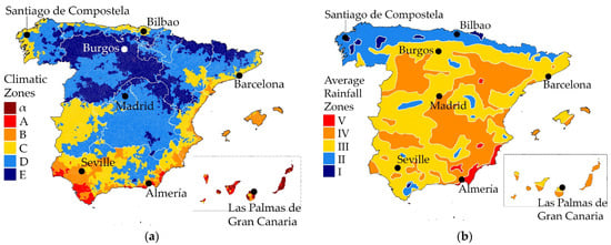 In order to cover the entire variety of climatic environments that exist in the Spanish territory, both on the peninsula and outside it, a selection of 8 cities is established that cover the 6 climatic zones and the 5 average rainfall zones (Figure 1 and Table 1). In accordance with the Spanish standard of buildings construction (Código Técnico de la Edificación, CTE), and the specific document about energy efficiency (Documento Básido de Ahorro de Energía, DB HE) [35], 6 climatic zones are identified based on outdoor temperatures and incident solar radiation, which serve as a reference for calculating the necessary insulation in the building envelope, both in new-build projects and in refurbishment. On the other hand, in the Documento Básico de Salubridad (DB HS) Spain is classified into 5 average rainfall zones based on the annual rainfall index [36]. The climatic zones are classified as α-A-B-C-D-E, with α being the characteristic climate of the Canary Islands, while on the peninsula the climates are classified from A, warmer, to E, colder. In the case of average rainfall zones, the following are differentiated, whose annual rainfall index (p) is indicated below: I (p > 2000 mm); II (2000 mm ≥ p > 1000 mm); III (1000 mm ≥ p > 500 mm); IV (500 mm ≥ p > 300 mm); V (p < 300 mm).