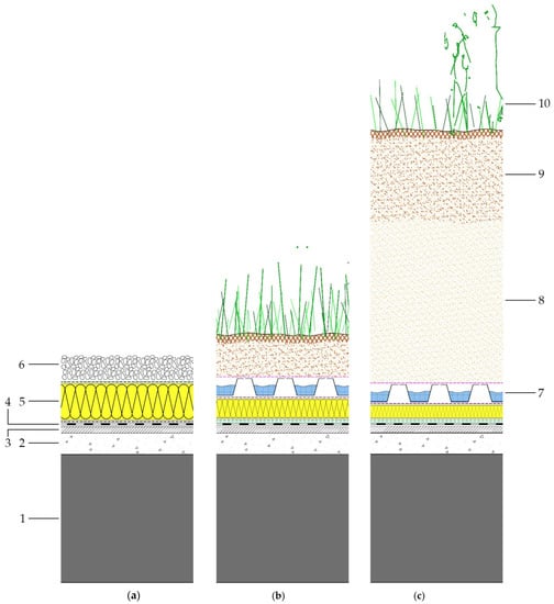 Figure 3. Roof models proposed for refurbishment: (a) traditional with gravel finish; (b) green extensive; (c) green intensive. Legend: (1) Support structure; (2) Slope formation; (3) Regulation mortar; (4) EPDM waterproof sheet; (5) XPS thermal insulator; (6) Gravel; (7) Drainage layer + Filter sheet; (8) Inorganic substrate; (9) Organic substrate; (10) Vegetation.