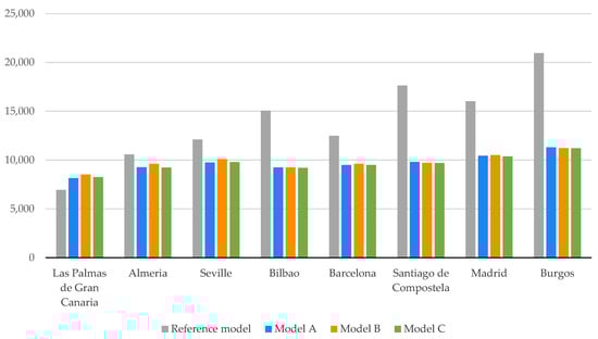 According to IDAE [57], the average values of total annual energy consumption of a single family house in Spain take the following values: (i) for a Mediterranean climate, 13,250 kWh; (ii) North Atlantic climate, 15,000 kWh; (iii) and Continental climate, 19,667 kWh. Figure 4 shows that the total annual energy consumption of the reference model fits these values. Almería, Seville and Barcelona are considered Mediterranean climates, Bilbao and Santiago de Compostela as North Atlantic climates and Madrid and Burgos as Continental climates. The climate of Las Palmas de Gran Canaria is not defined in the IDAE.