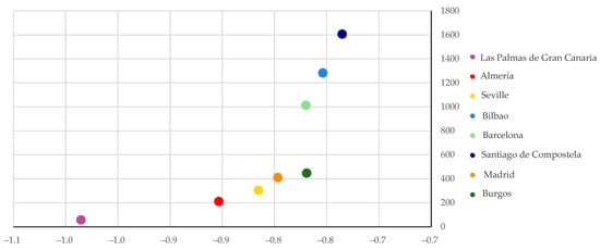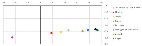 Taking Madrid and Santiago de Compostela as an example, two cities in climate zone D, it is observed that Madrid has an average annual temperature of 2.42 °C higher and a maximum average annual direct solar radiation of 172 W/m2 higher than Santiago de Compostela. In this case, the heat losses due to evapotranspiration in Madrid are −0.06 W/m2 higher than in Santiago de Compostela, despite the fact that in this city the annual rainfall has been 1195.7 mm above the values for Madrid. Comparing the case of Bilbao and Barcelona (climatic zone C), it is observed that despite presenting a similar average annual temperature variation (2.43 °C), the lower variation of the maximum average annual direct solar radiation (122 W/m2) the produced values of evapotranspiration losses in these cities are closer (−0.75 and −0.77, respectively, being higher in the city with the highest average annual temperature and maximum average annual solar radiation).