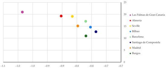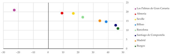 On the other hand, if heat losses through evapotranspiration are related to the mean annual outdoor temperature, a relationship is observed between the higher temperatures and the increase in heat losses through evapotranspiration (Figure 6). In this case, Las Palmas de Gran Canaria, Almería, Seville, Barcelona or Madrid have average annual outdoor temperatures above 15 °C, producing greater losses than in the case of cities with lower average annual outdoor temperatures. These cities also are the ones with higher annual rainfall. It can be seen how in addition, the decrease in the average annual temperature produces a decrease in losses due to evapotranspiration, especially in the gap between Las Palmas de Gran Canaria (average annual temperature of 20.95 °C) and the rest of the cities with average annual temperatures below 20 °C.