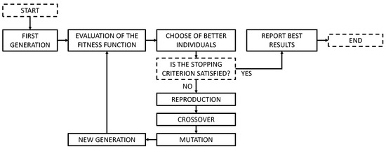 The GA, often used in optimization problems, is one of the EAs [56]. It is based on Darwin’s natural selection according to which, with the increase of generations, there is an increase of individuals presenting optimal characteristics for the environment in which they live [56]. From an optimization point of view, the GA finds the parameters that minimize or maximize a fitness value dependent on a certain function called fitness function. To perform a GA optimization, it is necessary to choose not only the fitness function but also the domain of the parameters to be identified, the number of individuals of the initial population, and the stopping criterion. The latter is the condition to be satisfied for the stoppage of the evolutionary procedure to occur, and it is usually selected among maximum number of generations, maximum time for the optimization procedure, maximum number of stall generations, or achievement of a certain fitness value. The GA begins with the creation of the first generation made up of a preselected number of individuals randomly chosen among all possible combinations and, for each of them, the fitness value is calculated. Individuals with the best fitness values are selected to create a new generation of individuals obtained through reproduction, crossover, and mutation operations [57]. This evolutionary procedure will continue until the stopping criterion is satisfied. The classical GA scheme is depicted in Figure 1.