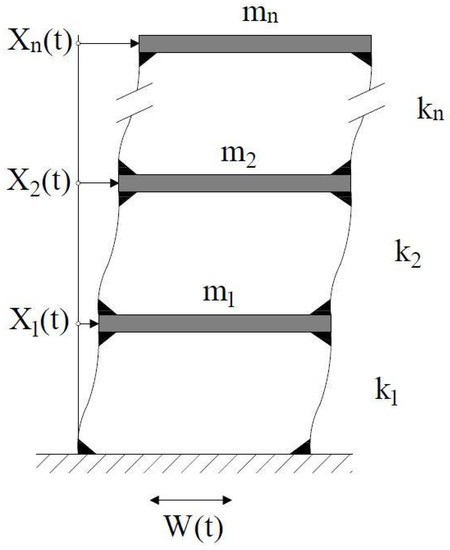 To validate the proposed method and to assess its reliability, several numerical simulations were performed on two MDoF classically damped systems: a 3DoF and a 5DoF shear-type frame. The general MDoF shear-type frame is depicted in Figure 2, and, for n = 3 and n = 5, it coincides with the aforementioned frames.