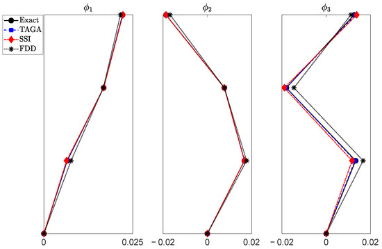 Comparison between the identified modal shapes and the exact ones for the 3DoF system.