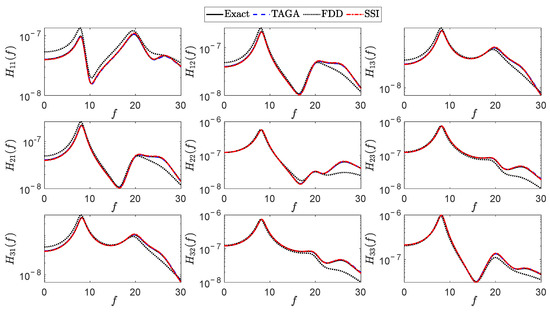 Finally, the discrepancies calculated as in Equation (27) in the case with 50 samples of the output process are , , and , respectively, for TAGA, SSI, and FDD. These results show that even in this case, TAGA can identify the FRF matrix better than SSI and FDD. Thus, the proposed method can be considered reliable also in the case in which instrumentation noise is present. However, a method for the noise reduction consisting of filtering the PSDs of the structural output [4] can be applied before performing the identification in order to reduce the discrepancy.