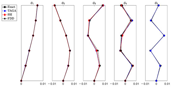 The results reported in Table 3 and Table 4 show that the proposed method reports very low discrepancies that are, in most cases, lower than those reported by the other methods. Furthermore, from the results reported in Figure 3, it is clear that the proposed method allows one to identify all the modal shapes with high accuracy.