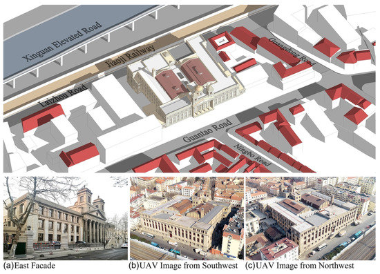 The Qingdao Exchange Building is currently located between the old and the new urban areas. The building faces Guantao Road and Liyuan Courtyard (a type of multifamily residential area in modern Qingdao) in the east (Figure 8a), and the Xinguan Elevated Road and Jiaoji Railway in the west, a new urban area with high-rise buildings completed after the 21st century (Figure 8b). As the largest Modern Architectural Heritage on Guantao Road, the building basically retains the original spatial pattern and style characteristics.