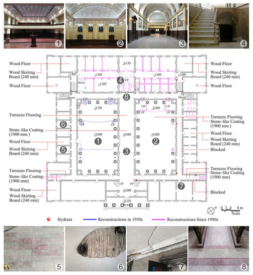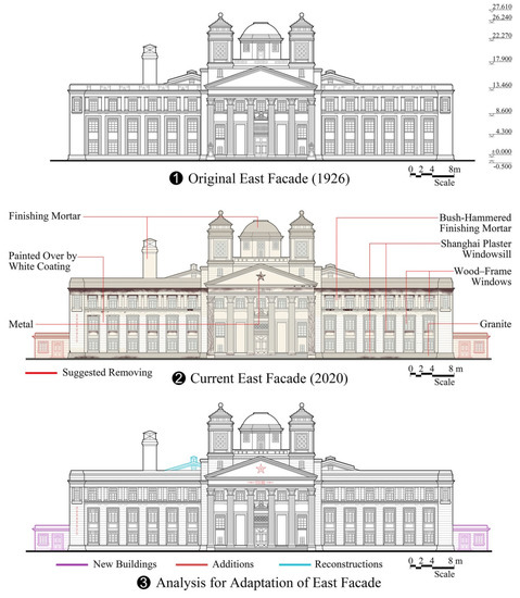 The belief of the present authors is that the analysis of the “original state” should be multi-dimensional and inclusive. Further, the value of the architectural heritage presents diachronic and synchronic characteristics and needs to be reasonably evaluated. According to the style of the Qingdao Exchange Building, the building has high artistic value while acting as a historical witness of the cultural exchange between China and the West in modern times and as a capital authority at the beginning of its completion, which is all reflected in the integrity of the architectural style. From this perspective, several of the additions that affected the integrity of the architectural style could be regarded as meaningless. In terms of space, the overall spatial pattern composed of four trading halls and small unit rooms during the initial construction period reflects the main characteristics of Exchange buildings and shows high historical value as a representative of the specific building type. Moreover, the southeast trading hall, which was later transformed into a theatre with a mezzanine added as a balcony, is a historical witness to the specific historical period of the North Sea Fleet Military Club after 1960. The initial spatial pattern and the transformed single space together constitute the historical value. Therefore, only under rigorous historical research and diversified value analysis can damage by excessive intervention to the architectural heritage value be avoided so as to retain the authenticity of information at different historical stages.