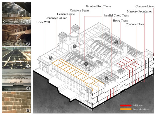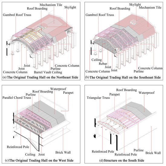 In terms of structure, a mixed structure system was adopted for the building, with brick walls and columns as the vertical structure, reinforced concrete beams and floors as the horizontal structure, and Western wood trusses as the roof structure (Figure 10). Such structure is a common structural system in modern Chinese public buildings and shows the advantages of the compressive strength of bricks and the flexural strength of reinforced concrete and wood. According to the “Safety Appraisal Report of the Qingdao Exchange Building”, the main structure is basically safe and stable, with partial damage to the reinforced concrete beam, floor, and other parts, including concrete cracks and spalling, steel-bar corrosion, local decay, and node rusts of the wooden trusses [41].