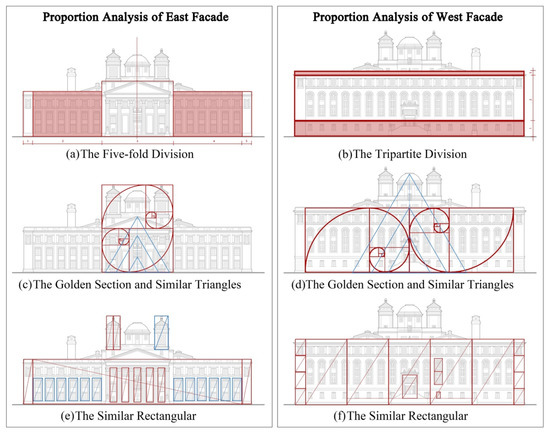The facade composition, elements, and bas-reliefs of the Qingdao Exchange Building are all aspects of Neo-classicism. The east and west facades are in a symmetrical layout of five-fold division (Figure 13a) and tripartite division (Figure 13b), with geometric proportions such as the golden section, similar triangles (Figure 13c,d), and rectangular shapes (Figure 13e,f). Part of the frieze is decorated with shallow relief such as fret and scroll. As the main entrance, the eastern portico has a classical hexastyle composed of four parts: the pediment, entablature, columns, and base. For the portico, eustyle spacing was applied with the Corinthian order and the intercolumniation of two and one-half diameters, which was considered to provide beauty and strength by Andrea Palladio [48]. The entablature is composed of the architrave, frieze, and cornice, fitting the composition of classical architecture, while the decorative elements are simple. A dome and two towers are set above the porch, forming the vertical and majestic shape. Overall, the building creates a solemn and elegant image of a modern financial building through the axisymmetric plane and facade pattern, the proportion and vocabulary of Classical Architecture.
