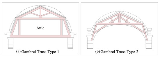 Gambrel trusses were applied to the original securities trading halls on the northeast and southeast sides, which are the core spaces. Commonly used in traditional European buildings, the gambrel roof is a symmetrical two-sided roof with two pitches on each side. To maximize the headroom inside the building’s upper level and shorten what would otherwise be a tall roof, the lower slope is steeper than the upper slope [49]. Different from the mansard roof, a gambrel has gable ends instead of being hipped at the four corners of the building. There are two typical gambrel truss types. The first type consists of an upper basic king post truss and a lower triangular stress system at both ends through a web at the hip for providing additional spaces as an attic (Figure 15a). The other type is not provided with the web at the hip instead of a diagonal brace connecting the lower chord and the opposite upper chord so as to maximize the clear height of internal space (Figure 15b).