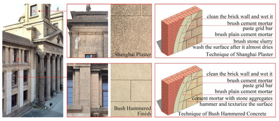 For instance, water brush stone, also called Shanghai Plaster, is the main material of the windowsill and tower in the Qingdao Exchange Building. Shanghai plaster became a typical decorative render with the introduction of cement in modern China and is also widely used in Southeast Asia [51]. Such render encompasses an exposed aggregate system with natural pebbles, marble chippings, granite gravels, and inert granular materials such as sand, gravel, and crushed stone. After being plastered, the cement binder is washed with water in order to expose the aggregates. The material is regarded as weather-proof and gives the appearance of sculpted stone.
