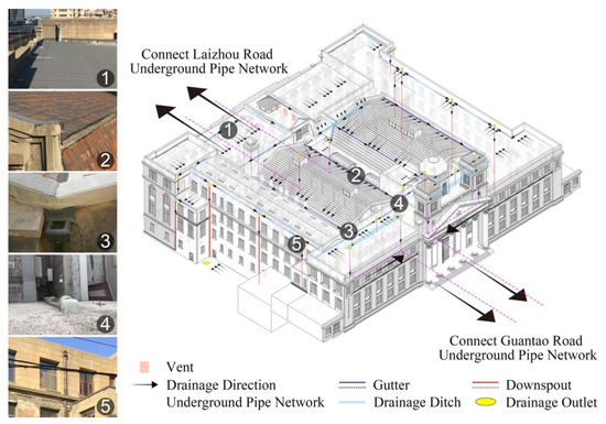 Due to the centralized layout, the building covers a large area with differences in roof form and height. Based on the height difference, a combination of parapet drainage and gutter drainage was adopted for the drainage system, forming multiple catchment areas. Rainwater flows into the outdoor ground or underground drainage pipeline through downspouts and then flows into the municipal drainage pipe network. Aside from several downspouts and ditches, which are seriously damaged, and the northern roof transformed into the parapet drainage outside the flat roof due to a fire, the drainage system basically retains the initial pattern (Figure 17). The drainage system has been used for nearly a century, verifying the rationality of the design and showing high scientific value.