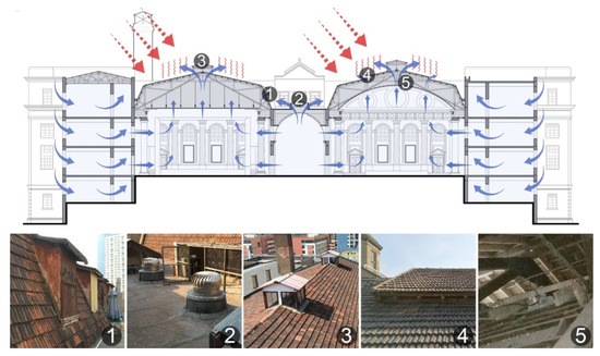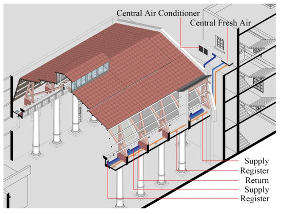 - The existing equipment and facilities should be repaired first, including downpipes, drainage ditches, and passive ventilators. Subsequently, based on the needs of new uses, modern equipment such as air conditioning and fresh air systems should be implemented (Figure 24). The new equipment should be hidden and avoid damage to the building’s values. Additionally, the thermal performance should be improved by replacing the double-layer window so as to allow for the building to better serve modern life.