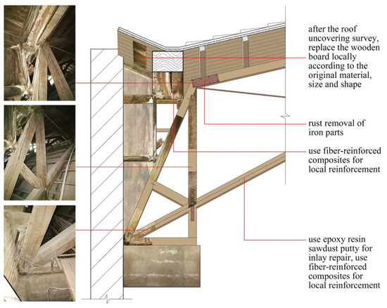 - The structural system should be retained, and the original stress system should not be changed. To address structure-related unsafe factors, reinforced structures and reinforced materials should be added, damaged components should be replaced, and reversible reinforcement measures should be preferred. The newly added structure should be placed inconspicuously, and the replacement component should be marked with the year and the designer [58].