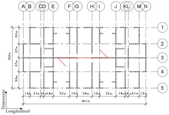 This research involved the study of timber housing buildings with one, three, or five stories, depending on the analysis performed. The plan dimensions of the building were 24.1 m in length by 12 m in width, with 2.44 m of inter-story height. The floor plan of the archetype is shown in Figure 1, where the red arrow represents the orientation of the load transfer direction of the one-way floor system. The total heights of the building floors were 2.44 m, 7.32 m, and 12.2 m for one, three, and five stories, respectively. The research archetype involved 3.1% and 5.1% wall densities in the longitudinal and transverse directions related to total wall lengths of 59.1 m and 97.1 m, respectively.