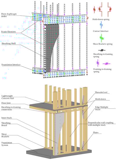 Detailed coupled three-dimensional numerical models were developed in OpenSees [31]. Every component of the timber light-frame wall is included (studs, sheathing boards, plates, nails, and mechanical connections), as well as the friction and contact interactions at the foundations and floor slabs. Figure 2 shows the wall components and the corresponding finite element model.