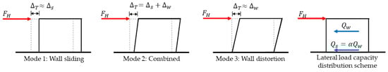 For the single-story system, Figure 4 presents the three global failure modes considered. The first is mode 1, which considers that the total lateral roof displacement under a horizontal load is mainly provided by the base sliding mechanism (), while the wall distortion displacement () is negligible. The opposite behavior is defined for mode 3, where is now attained principally by , while is very small (promoting a racking-dominant behavior). Furthermore, a combined mode (mode 2) is defined when both and are large enough, and neither of them can be discarded.