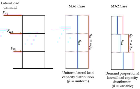 The M3 model is employed to examine the effect of the lateral load capacity distribution in height on the story displacements. For the capacity curve calculations, the lateral load patterns considered are a lateral load pattern according to the seismic force demands of the Chilean seismic code [28] and of the ASCE 7–16 code [43], an inverted triangular distribution, and a distribution that promotes a first vibration mode equivalent deformed shape. Two lateral load capacity conditions are studied. The first one assumes that the load capacity is uniform in all stories, being defined by the first story’s design configuration (this condition is defined as uniform). The second condition supposes that every story is designed with a load capacity proportional to the respective lateral force demand, so the sheathing-to-framing connection load response is adjusted to match the imposed demand (stated as variable condition). The uniform condition is studied through case M3-1, while the variable is analyzed in case M3-2. For both conditions, an factor is considered for all stories; hence, the story sliding capacity is twice the story in-plane wall strength . Figure 5 shows the schematic representations of the lateral load capacity diagrams for the studied conditions.