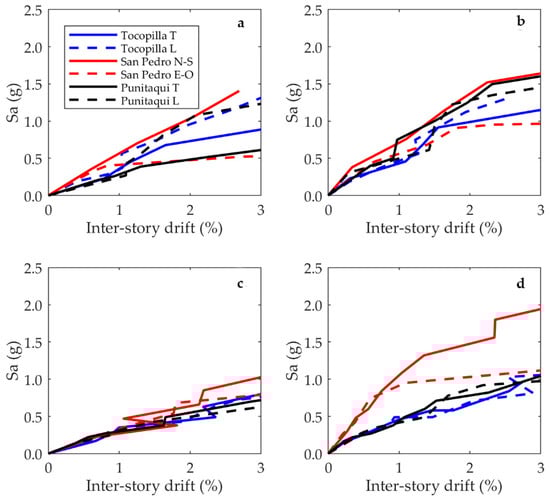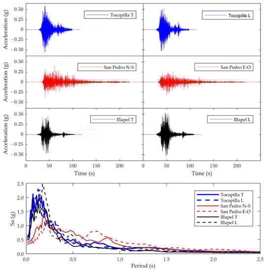 As observed in Figure 6, the ground motions reach PGAs of 0.6 g, 0.4 g, and 0.56 g for the Tocopilla, San Pedro, and Illapel records, respectively. Moreover, the ground motions’ significant durations are 33.59 s, 72.81 s, and 18.81 s for Tocopilla, San Pedro, and Illapel, respectively. In terms of the pseudo-accelerations, it can be observed that the Tocopilla and Illapel spectra achieve higher pseudo-accelerations for periods between 0.06 s and 0.23 s, while in the case of San Pedro recording, the spectrum achieves higher pseudo-accelerations for periods within 0.16 s to 0.87 s.