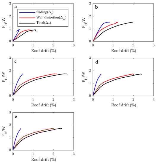 The effect of the lateral deformation mechanism on the global failure mode is shown in Figure 7, where the M1 model pushover curves in the transverse direction are presented in terms of the ratio between the lateral load applied () and the weight of the structure () against the story drift for each factor considered. In every plot, the total lateral drift curve is displayed along with the distribution of this deformation into the two displacement mechanisms defined.