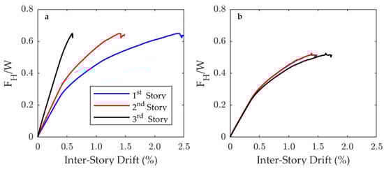 Furthermore, the results in Figure 8 are consistent with the findings of Perry et al. [47]. They show that the triggered failure mode is a soft-story mechanism when the story load capacity is uniform in all stories, which is the same behavior that can be observed in Figure 8a for the uniform case. In addition, the cases studied by Perry et al. [47] for the variable load capacity in height show the same trend presented in Figure 8b for the variable condition. When the story load capacity is variable, the lateral deformation is balanced between stories, but the largest displacement occurs on the upper floors.