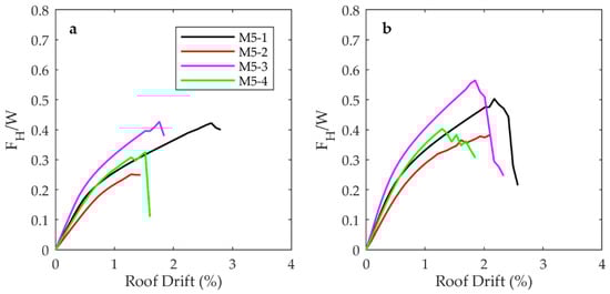 As observed in Table 5, a strong relationship between the triggered failure mode and the ductility capacity can be observed. When the wall distortion controls the promoted failure mode () and a balanced inter-story drift distribution occurs ( = variable), the larger global displacement ductility values are reached (4.11 and 4.37 for the longitudinal and transverse directions of model M5-1). As expected, the opposite situation occurs for a combined failure mode () with concentrated inter-story drift demand ( = uniform) (model M5-4 in the longitudinal direction). Furthermore, it can be observed that the triggered failure mode also influences the yield point. When , the structure tends to have a higher elastic stiffness that promotes a yield roof drift between 0.49% and 0.64%. In contrast, for , the yield roof drift increases to the range of 0.60% to 0.81%. Therefore, the results suggest that for combined failure modes (mode 2, ), the yielding of the system is delayed but the collapse occurs sooner.