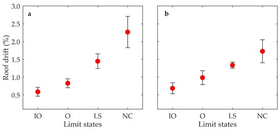 Roof drift and limit state relationship according to the triggered global failure mode (red dots are average drifts and back lines show max and min values): (a) ; (b) .