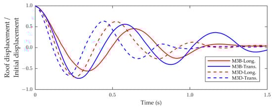 In addition, the pushover analysis results of the M3-1 and M3-2 models are employed to examine the effect of the lateral load capacity distribution on the height in the story displacements. In this case, is considered for all stories in order to promote a wall distortion mode (mode 3). Various pushover load patterns are employed for both principal directions of the structure, although only the results using a lateral load distribution proportional to the first mode’s shape acting on the transverse axis are reported in this paper, because all cases showed similar results.