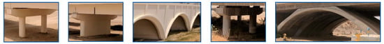 The selected study area (Al-Ain City, UAE) represents a medium seismicity region exposed to two distinct seismic scenarios. A bridge database collected in this study using satellite imageries and several confirmatory site visits indicated that most of the bridges in the study area were reinforced concrete (RC) multi-span span bridges supported on different substructure systems, as shown in Figure 1. Thus, the benchmark bridge was selected based on the on-ground survey of the bridge inventory in the study. The selected bridge consists of two identical structures, each composed of five spans, as shown in Figure 2. The superstructure consists of a RC deck supported on RC girders. In the longitudinal direction of the bridge, four parallel girders are extended over 14 m across the bridge. The superstructure is supported on elastomeric bearings. The bridge has one expansion joint between adjacent spans to allow thermal movement, including the expansion joints at the abutments. Each expansion joint is 40 mm. The substructure consists of four bents; each comprises two columns with a circular cross-section and a cap beam, as shown in Figure 2. The distance between the bridge bents is 14 m.
