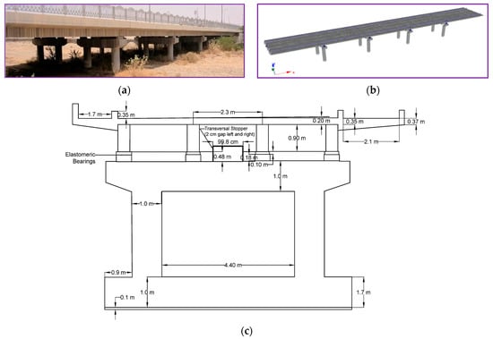 The benchmark bridge was selected based on the bridge survey conducted in this study to represent the typical multi-span bridges built in the case study area. As previously highlighted, the UAE was previously classified by the design code as a non-seismic zone. Therefore, old structures designed and constructed in the early 2000s and before in the study area (Al-Ain City, UAE) were considered in this study as pre-seismic code structures (i.e., designed without considering earthquake loads). The UAE is currently considered a low-to-medium seismicity region exposed to various seismic scenarios. Hence, the pre-seismic code structures represented by the benchmark bridge may be vulnerable to damage when exposed to natural hazards influencing their serviceability or functionality.