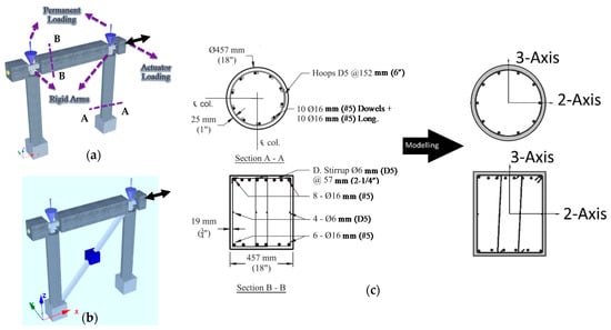 Idealizing of bridge bent for the verification of modeling approaches: (a) fiber-based model of existing bridge bent test specimen, (b) fiber-based model of retrofitted bridge bent with buckling restrained brace (BRB), and (c) modeling of the pier and cap beam sections.